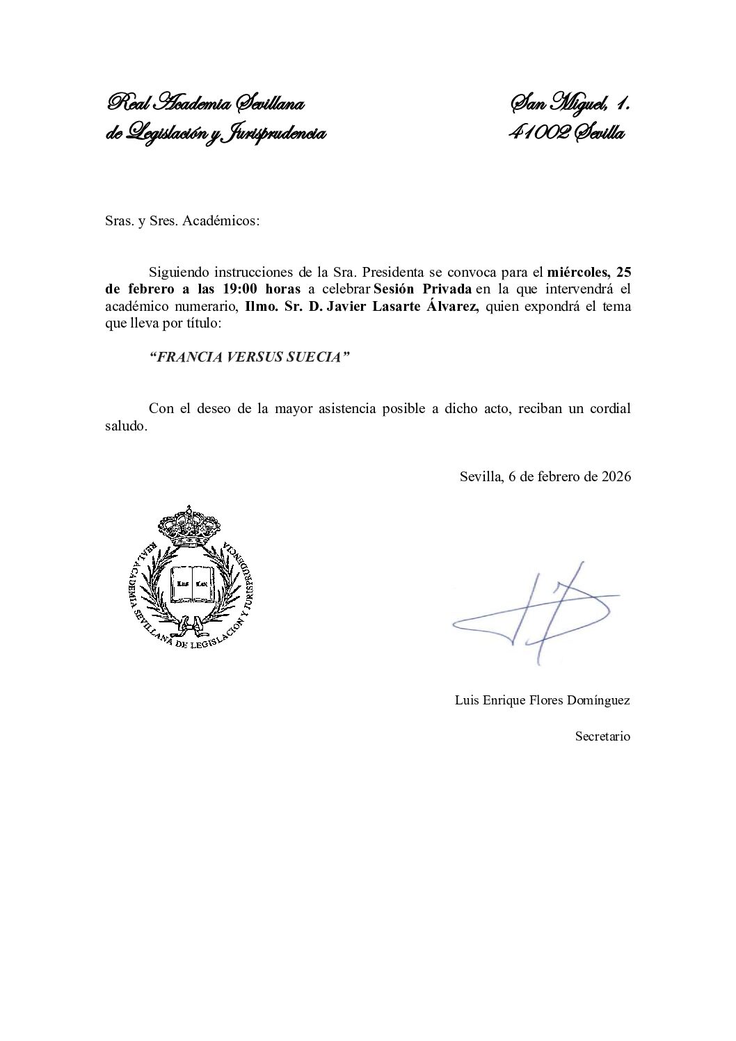 Miércoles, 25 de febrero de 2026, a las 19:00 horas, en la sede de esta Real Academia se celebrará Sesión privada impartida por el Ilmo. Sr. D. Javier Lasarte Álvarez con el título de «FRANCIA VERSUS SUECIA«.
