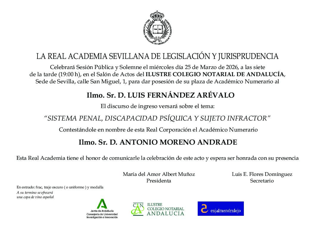 Ha ingresado en la Real Academia Sevillana de Legislación y Jurisprudencia el Ilmo. Sr. D. Luis Fernández Arévalo, Fiscal Jefe de la Audiencia Provincial de Sevilla, con su Discurso de Ingreso titulado «Sistema Penal, discapacidad psíquica y sujeto infractor», el día 25 de marzo de 2026. El Discurso de Contestación fue impartido por el Ilmo. Sr. D. Antonio Moreno Andrade, Académico de Número y ex-Presidente de esta Real Corporación.
