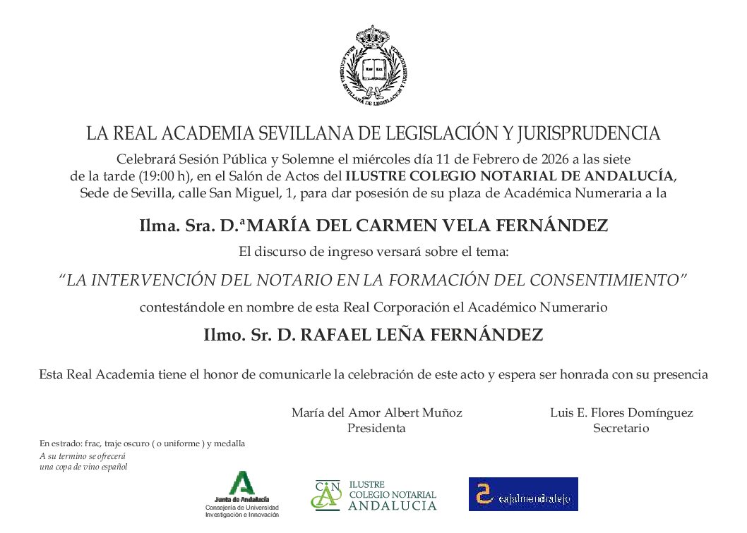 Celebrará Sesión Pública y Solemne el día, miércoles, 11 de febrero de 2026, a las 19:00 horas, en la sede de esta Real Academia, para el acto de toma de posesión de su plaza de Académica Numeraria de la ILMA. SRA. D.ª MARÍA DEL CARMEN VELA FERNÁNDEZ, quien expondrá el Discurso de Ingreso que lleva por título: