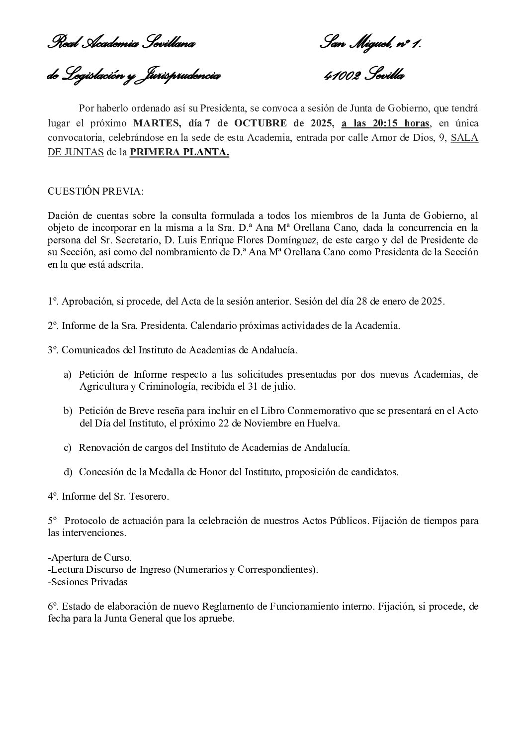 Celebrará Junta de Gobierno en el día de hoy, martes 7 de octubre de 2025, a las 20:15 horas.