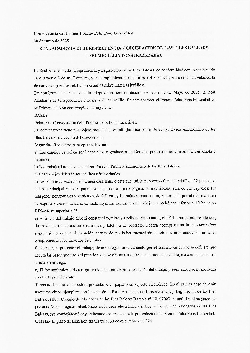 De conformidad con el acuerdo adoptado en sesión plenaria de fecha 12 de mayo de 2025, la Real Academia de Jurisprudencia y Legislación de las Illes Balears convoca el Premio Félix Pons Irazazábal en su Primera edición con arreglo a las siguientes