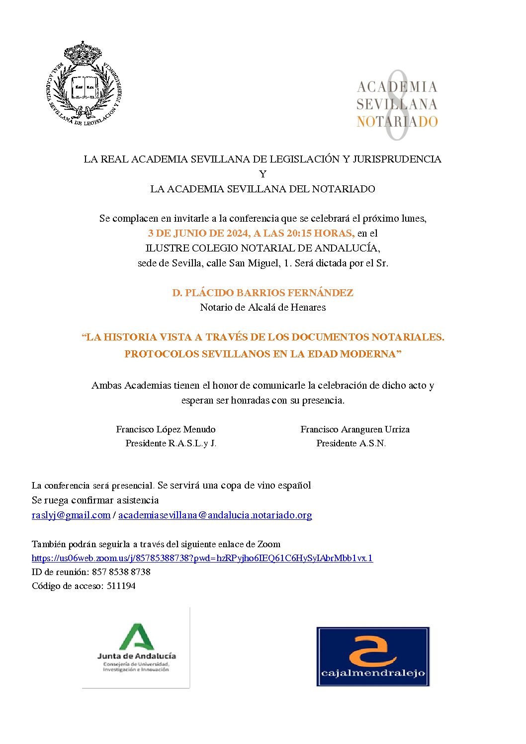 (20:15 h), en el Salón de Actos del ILUSTRE COLEGIO NOTARIAL DE ANDALUCÍA,