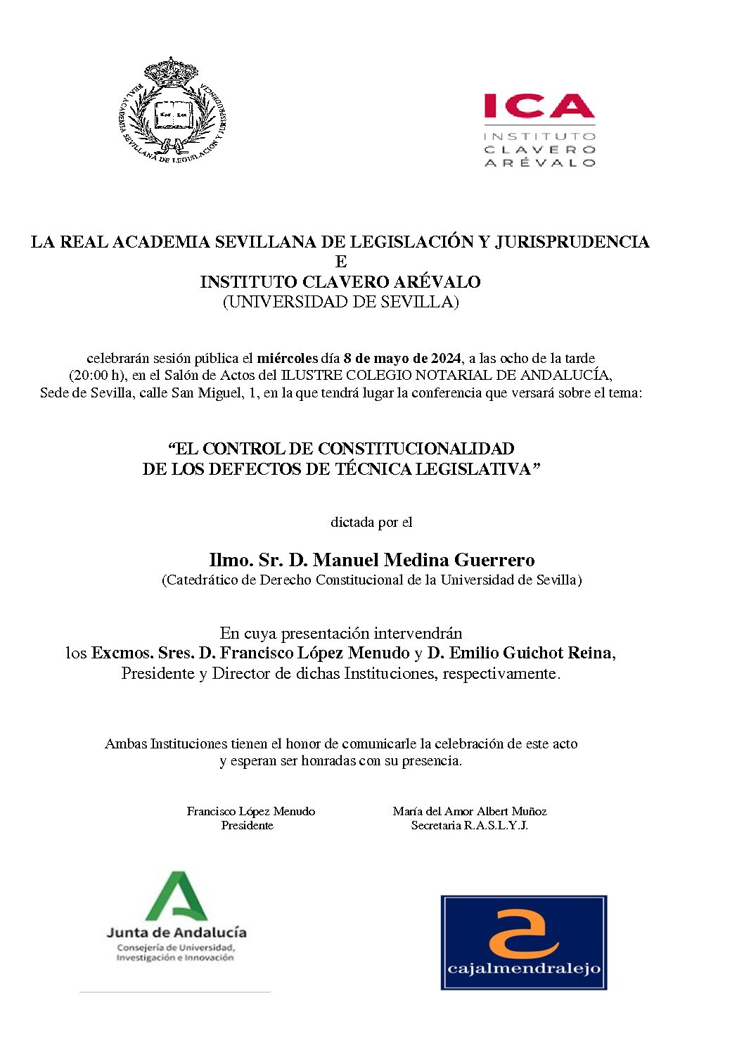 8 Mayo 2024 Conferencia del Ilmo. Sr. D. Manuel Medina Guerrero, Catedrático de Derecho Constitucional, titulada «EL CONTROL DE CONSTITUCIONALIDAD DE LOS DEFECTOS DE TÉCNICA LEGISLATIVA». Acto a celebrar en el Salón de Actos del Iltre. Colegio Notarial de Andalucía Sede de Sevilla, calle San Miguel, 1, 1ª Planta, a las 20:00 horas.