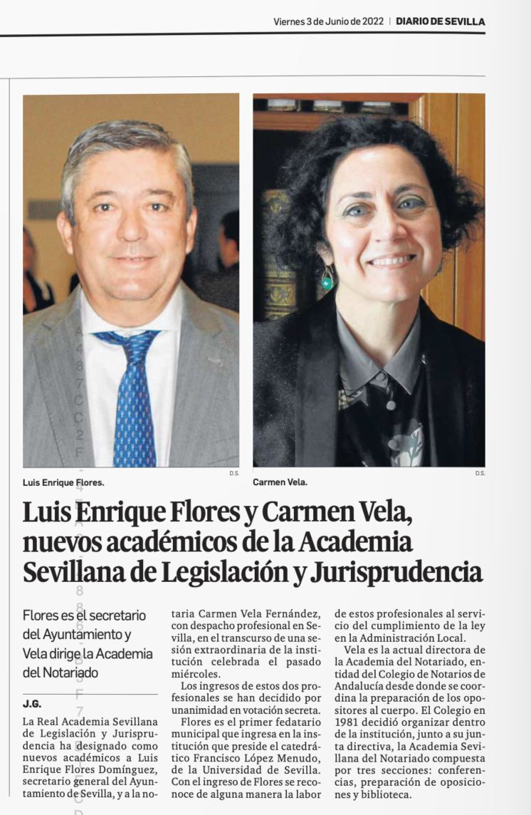 En Diario de Sevilla aparece la noticia publicada, con fecha de 3 de junio de 2022, en la que la Real Academia Sevillana de Legislación y Jurisprudencia ha designado como nuevos académicos de número a D. Luis Enrique Flores Domínguez, secretario general del Ayuntamiento de Sevilla, y a la notaria D.ª Carmen Vela Fernández, con despacho profesional en Sevilla y Directora de la Academia Sevillana del Notariado, en el transcurso de una sesión extraordinaria celebrada el día 1 de junio de 2022, en la que se designó por unanimidad.